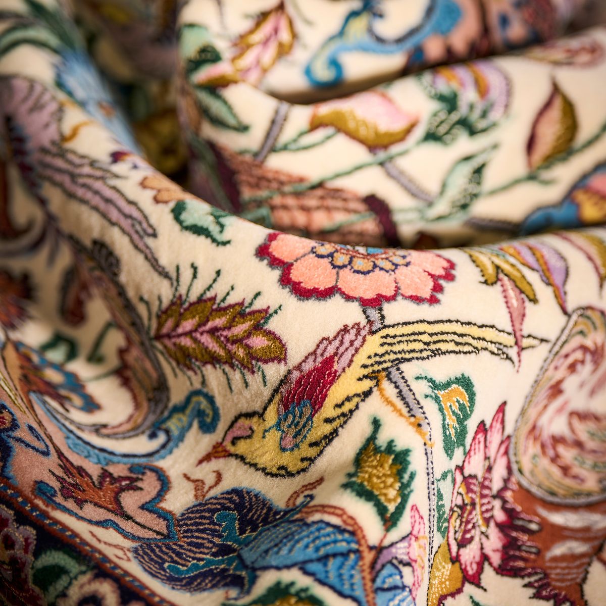 Crafted from wool & silk, these luxurious rugs display intricate floral patterns in vibrant colours.
