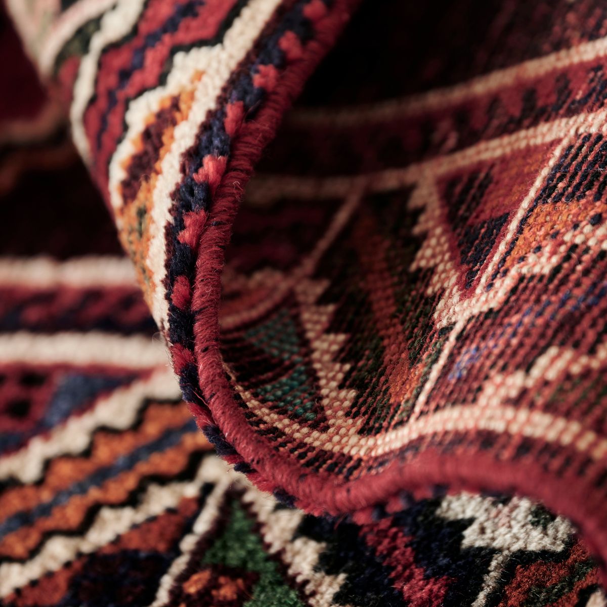 Expertly woven by the Kashghai tribe, these rugs feature bold geometric designs in red, orange and navy tones.