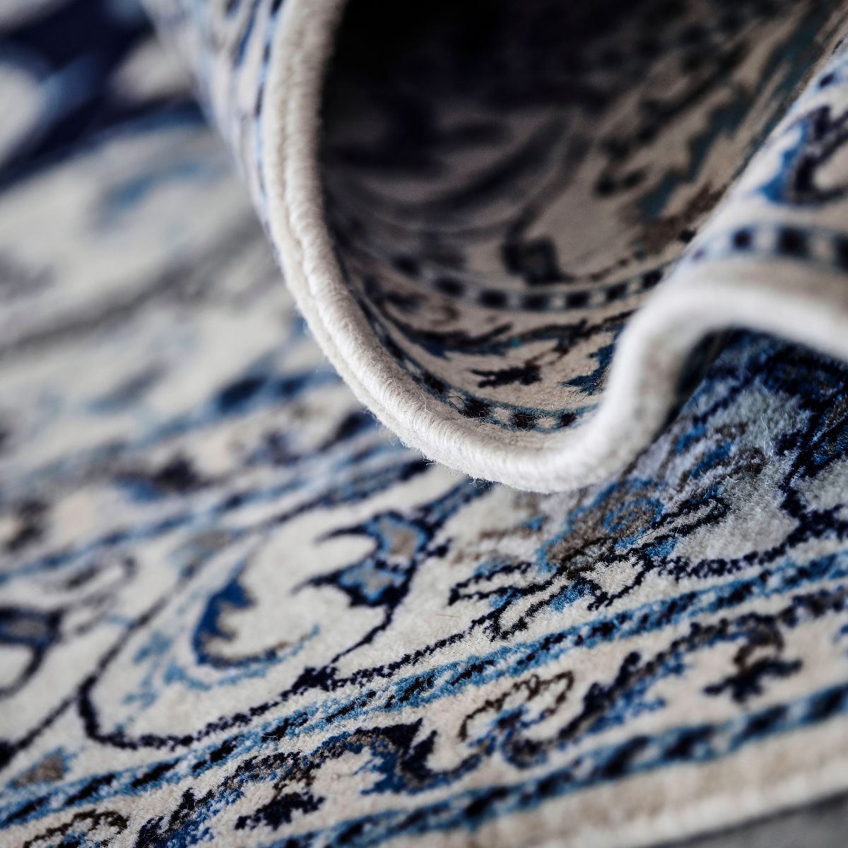 These fine, densely knotted rugs from Nain blend wool and silk, often showcasing floral designs in soft ivory, beige and blue tones.