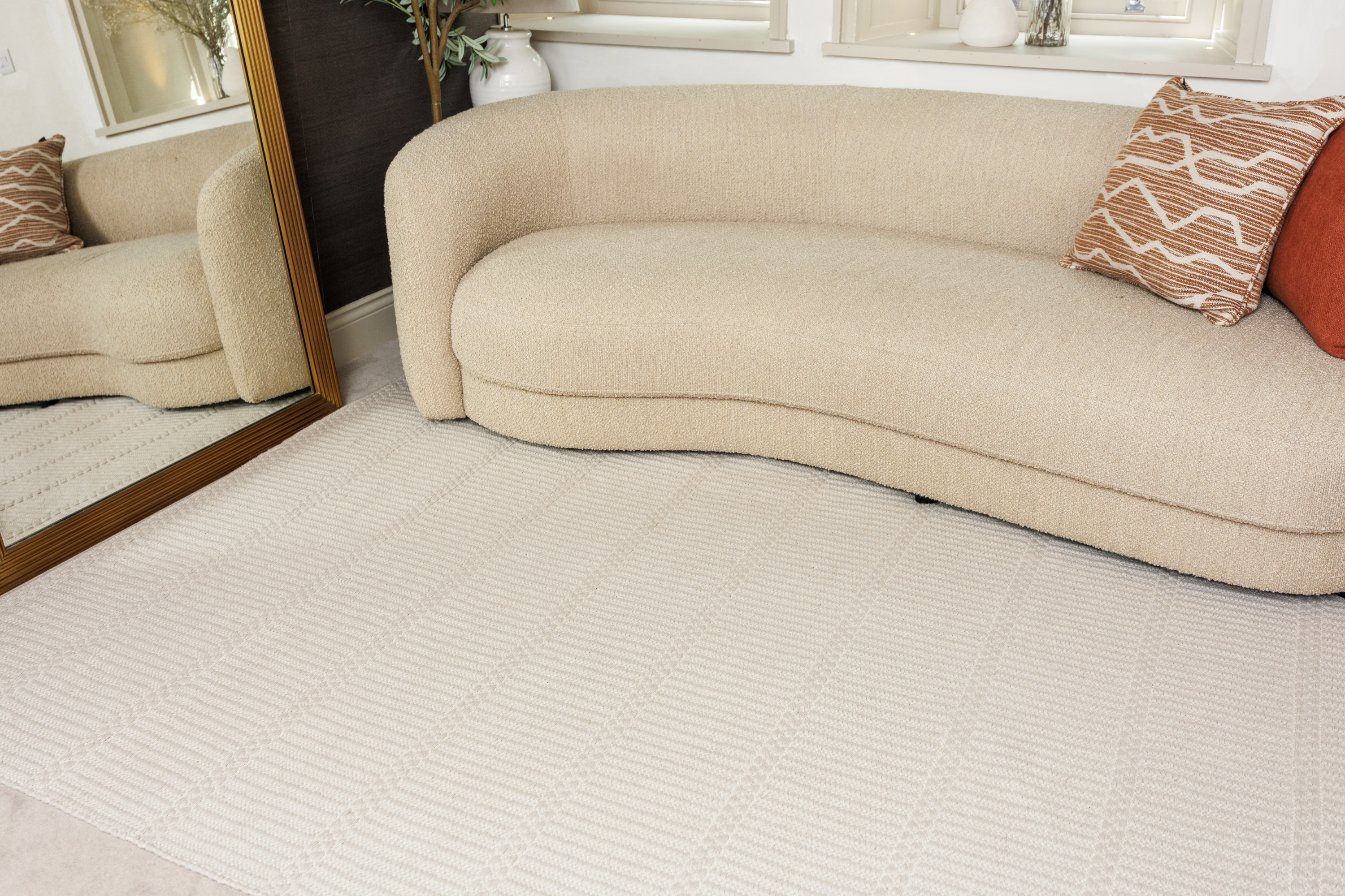 Part of the Rugs.ie x Geri Designs Collection, the Ogham Beige Rug is handwoven by artisans using responsibly sourced wool and recycled cotton. Inspired by the ancient Irish script, this design offers a modern interpretation full of quiet charm. Its soft beige base is accented by a gentle greige pattern, with the subtlest lilac undertone, creating a calming rhythm that settles easily into any room.