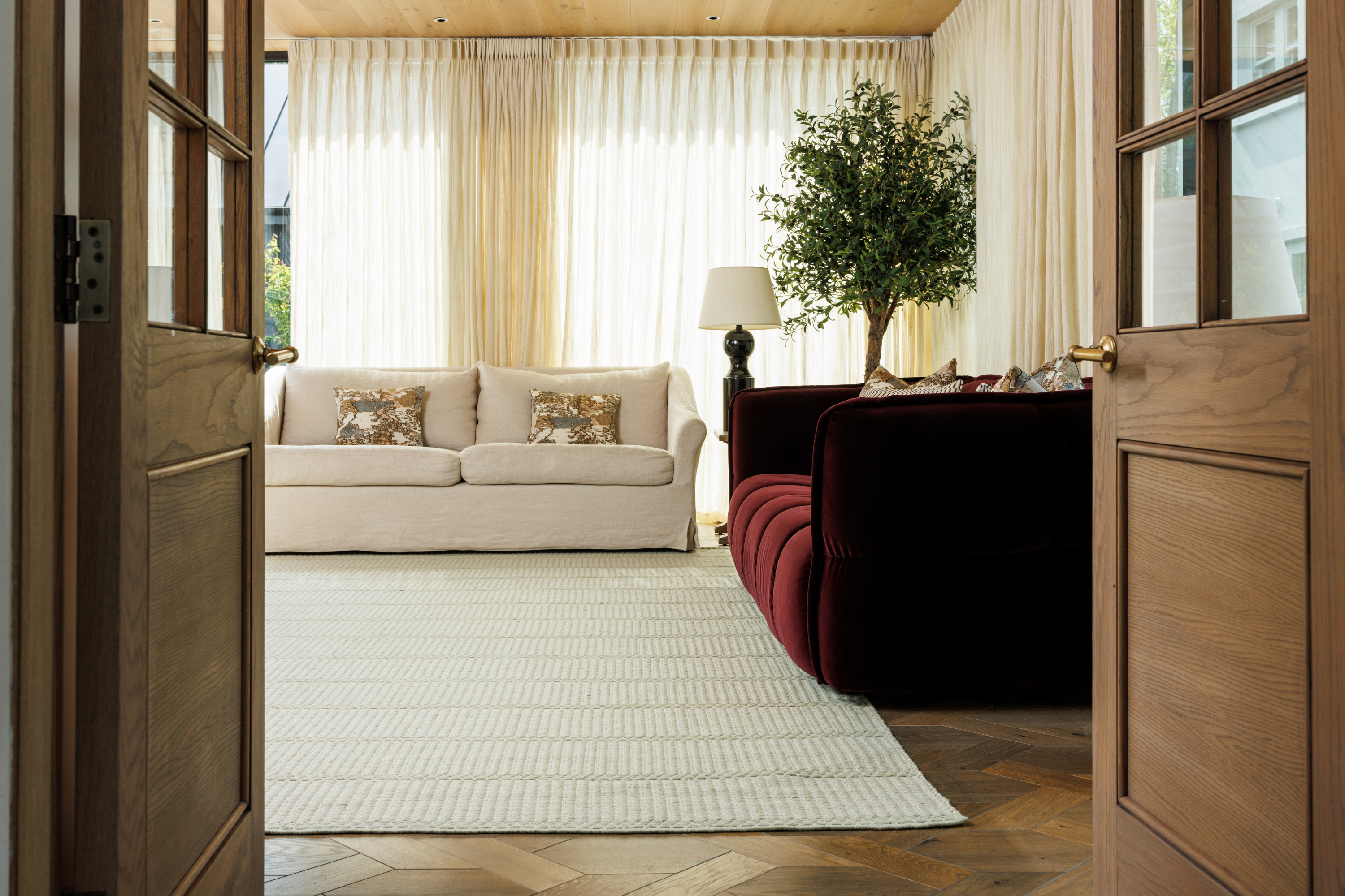 Rugs from the Ogham collection sit comfortably together in open plan spaces. Though varied in colour, Ogham rugs work harmoniously together as their complementary hues and repeated pattern create a cohesive, thoughtfully curated look.